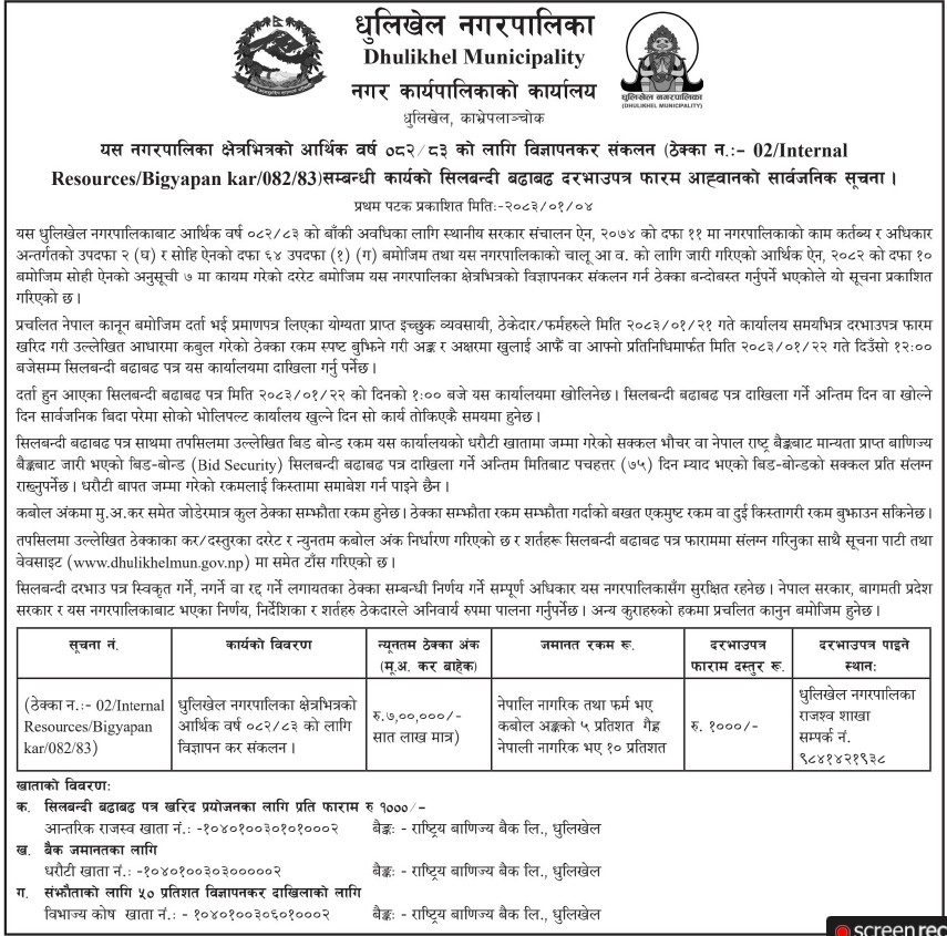 » बिज्ञापन कर संकलन सम्बन्धि कार्यको लागि शिलबन्दी दरभाउ पत्र आह्वानको सूचना !!