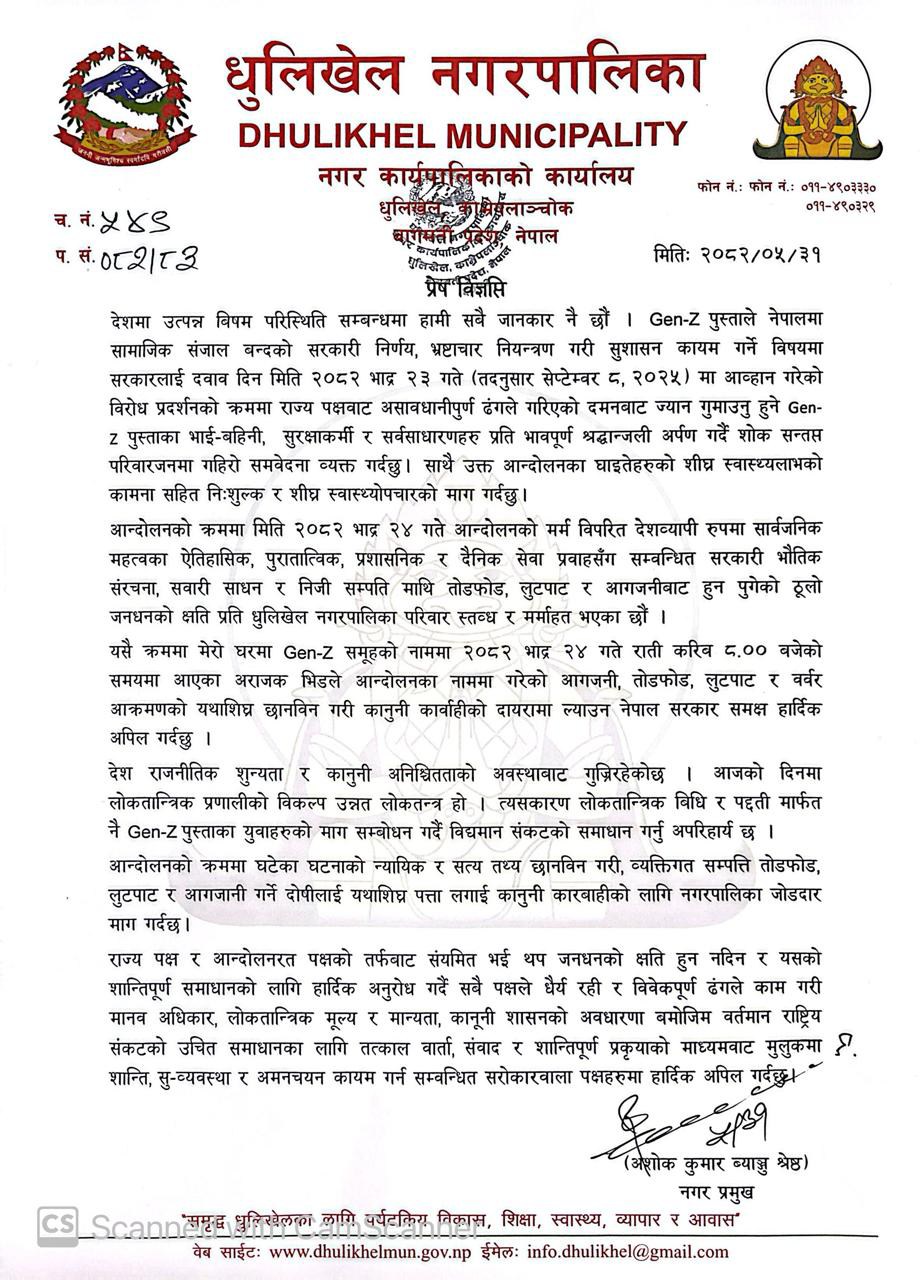 देशमा उत्पन्न विषम परिस्थितिमा धुलिखेल नगरपालिका द्वारा जारी प्रेस विज्ञप्ति !!