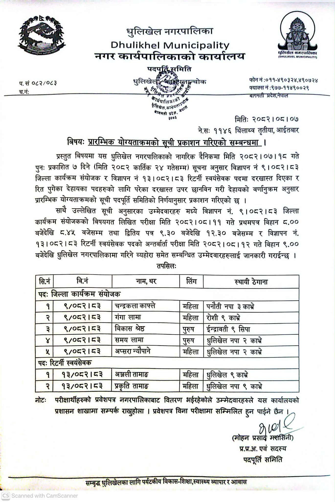 प्रारम्भिक योग्यताक्रमको सुची प्रकाशन गरिएको सम्बन्धि धुलिखेल नगरपालिकाको सूचना !!