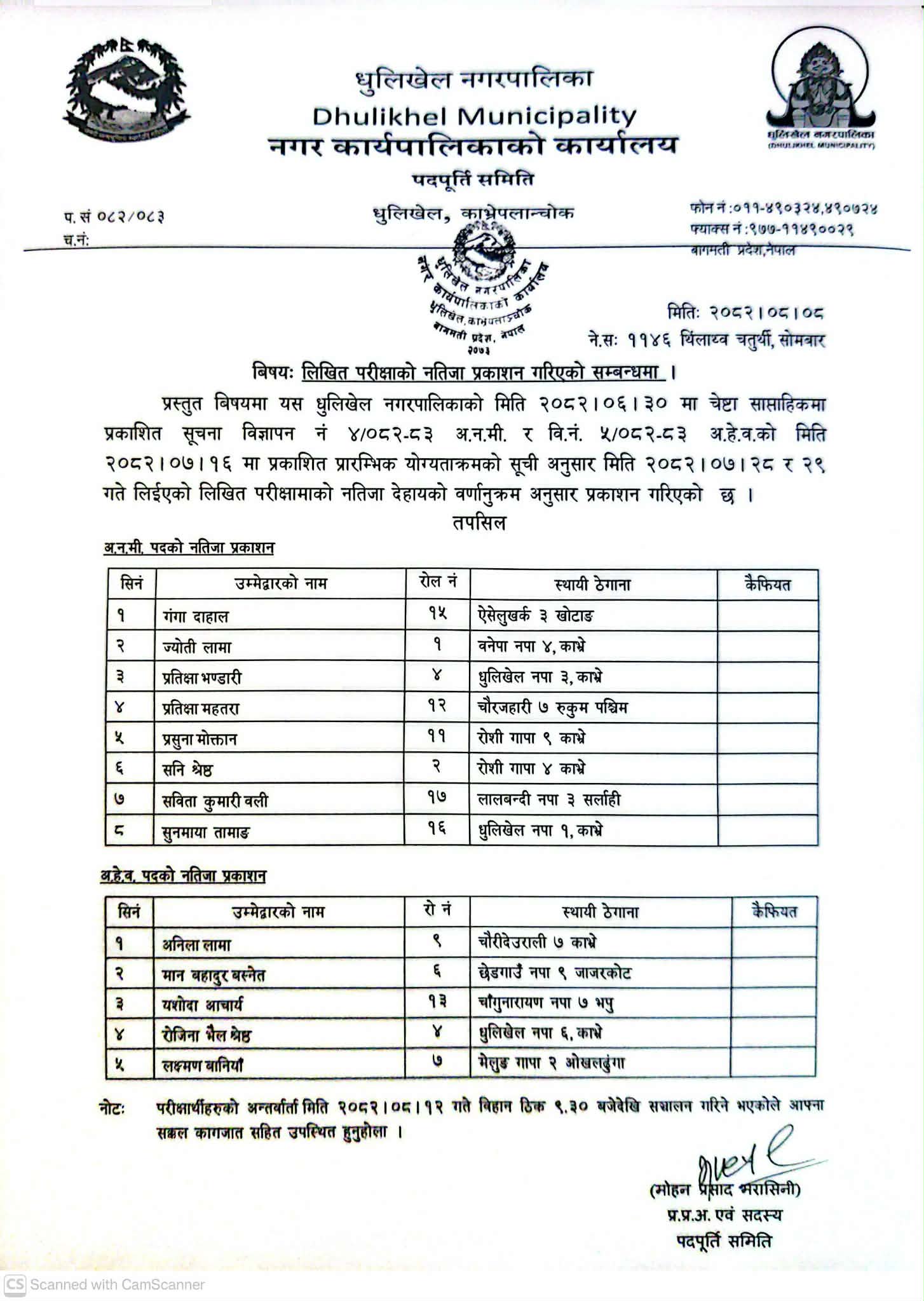 लिखित परिक्षाको नतिजा प्रकाशन गरिएको सम्बन्धि धुलिखेल नगरपालिकाको सूचना !!