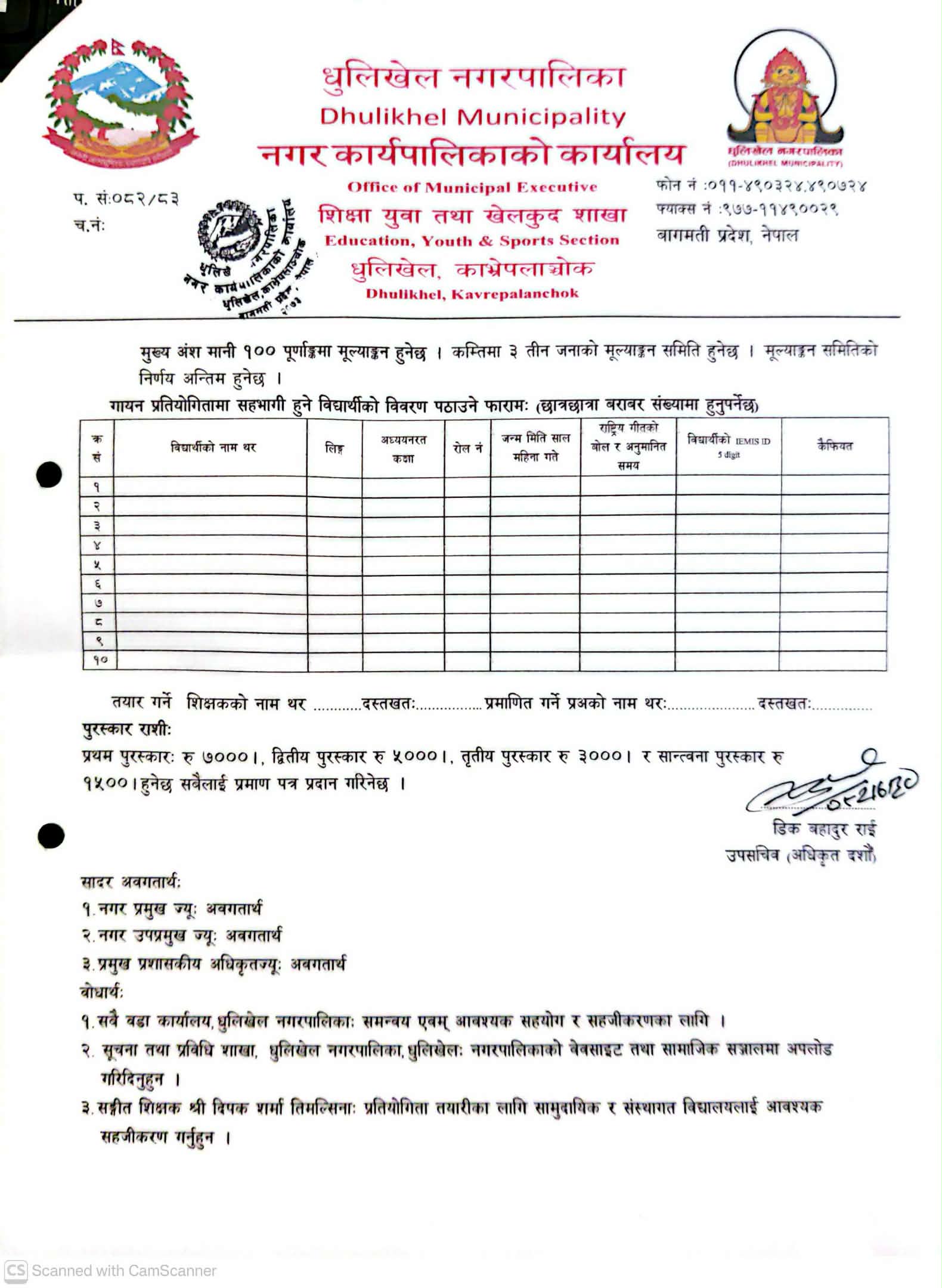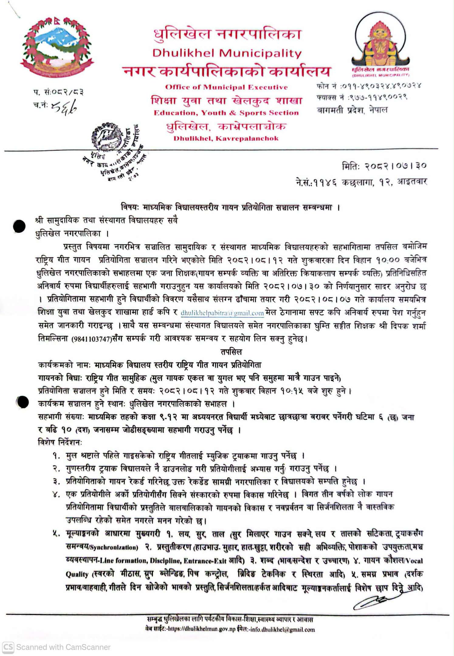 माध्यमिक विद्यालयस्तरीय गायन प्रतियोगिता संचालन सम्बन्धि धुलिखेल नगरपालिकाको सूचना ||